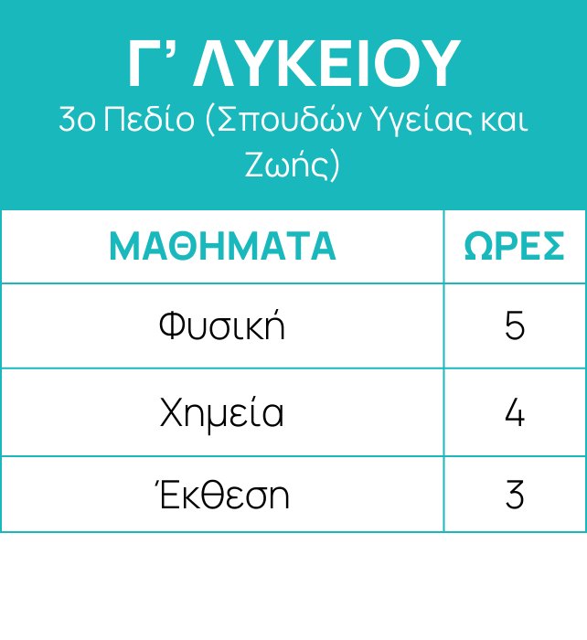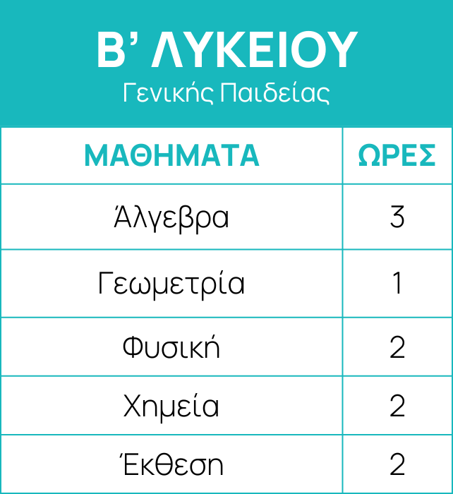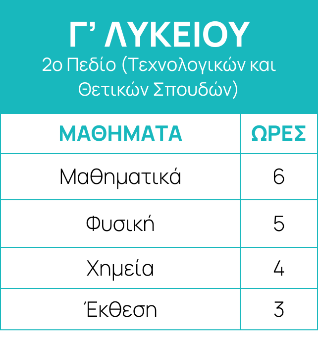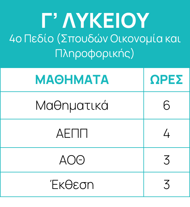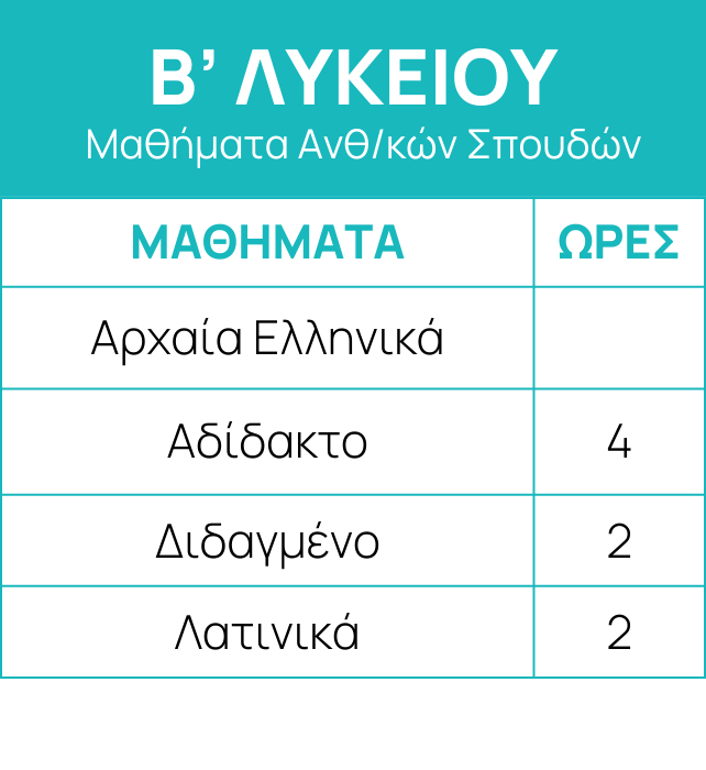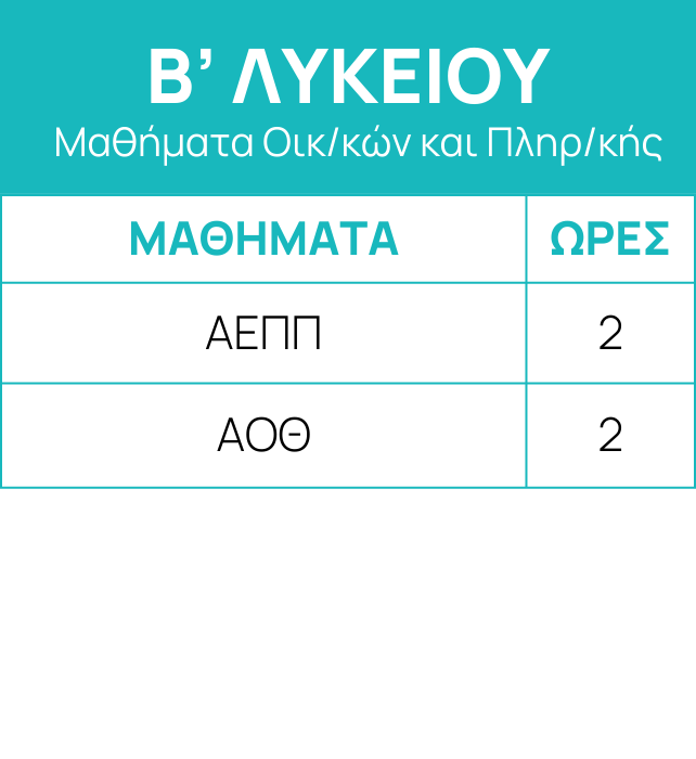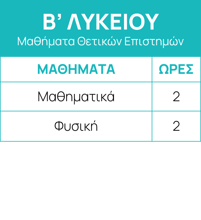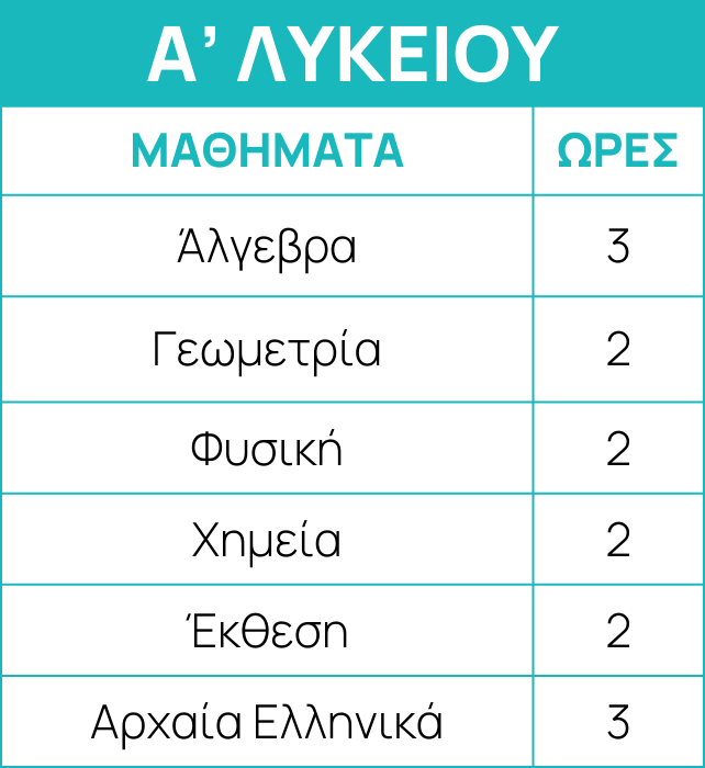Διδάσκουμε τα βασικά μαθήματα της Α’ Λυκείου και τα μαθήματα κατευθύνσεων της Β’ και Γ’ Λυκείου (Έκθεση, Μαθηματικά, Φυσική, Αρχαία, Λατινικά, ΑΟΘ, ΑΕΠΠ).